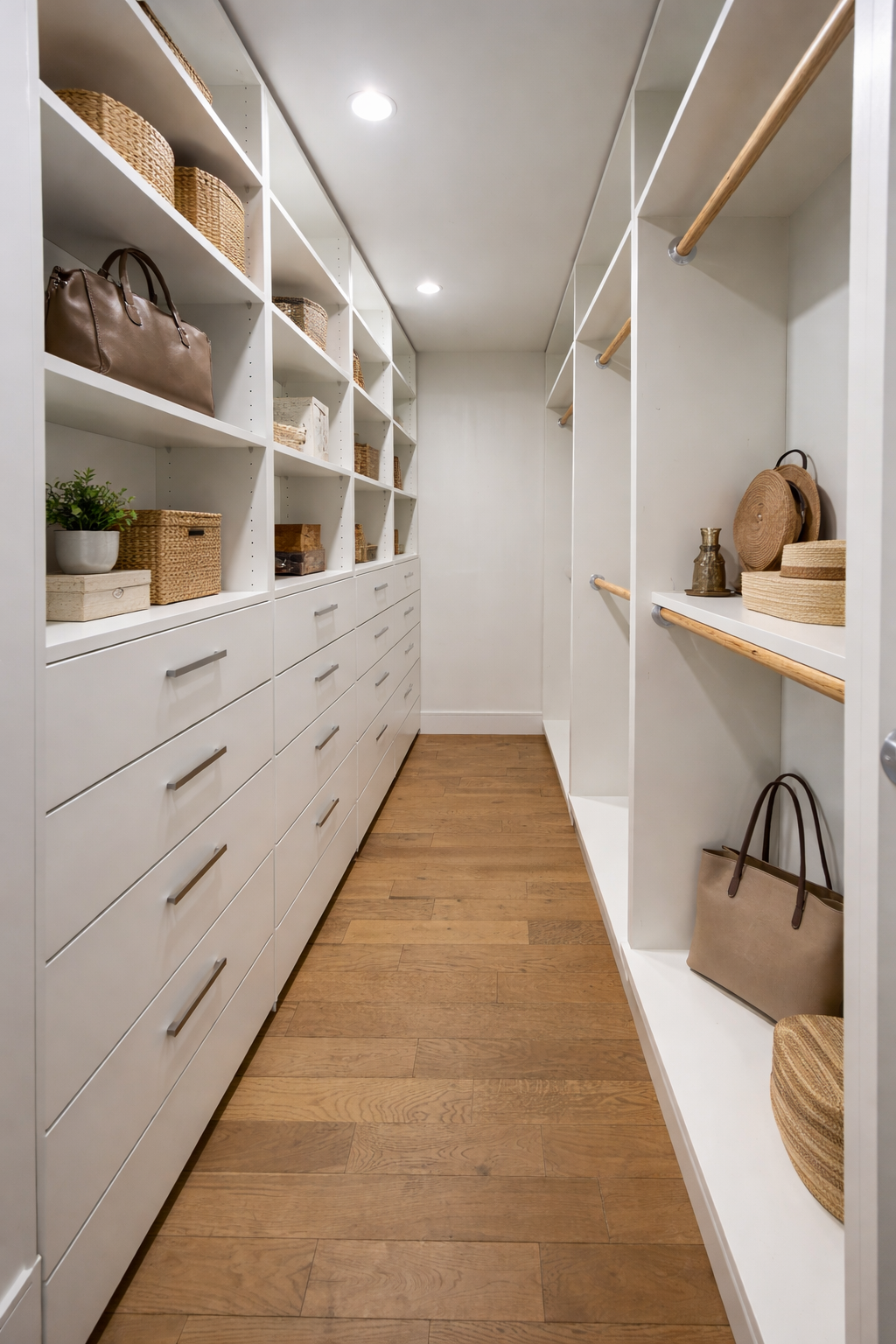 This custom-built walk-in closet was designed to maximize functionality without sacrificing style. Clean white cabinetry, full-extension drawers, and streamlined modern pulls create a crisp, cohesive look while providing extensive concealed storage. Open shelving is thoughtfully styled with woven baskets, handbags, and decorative accents to add warmth and personality without clutter. Dual hanging sections with natural wood rods offer efficient organization for everyday essentials, while deep drawers below house folded garments and accessories out of sight.