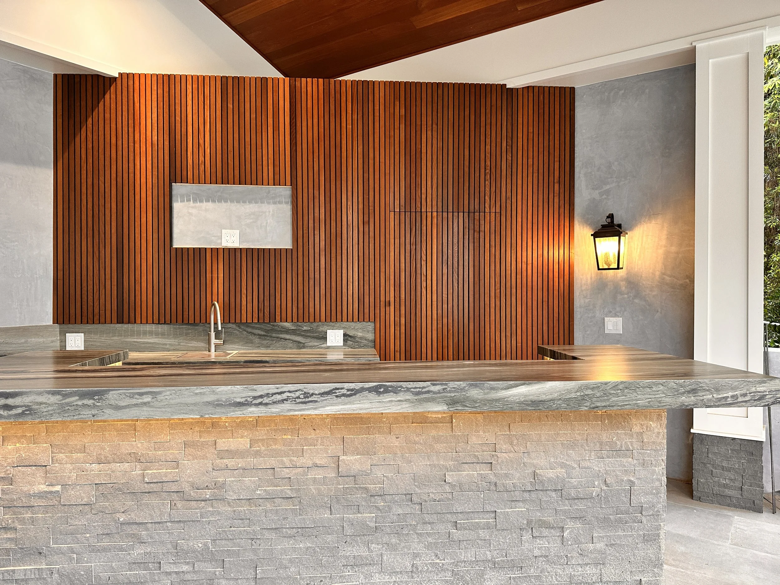 This project was a true collaboration—transforming the homeowner’s inspiration into a bold, architectural statement. Warm vertical wood slats create depth and texture, perfectly balanced by sleek stone surfaces and a sculpted waterfall countertop. Every line, material, and finish was intentionally selected to reflect the owner’s modern yet organic aesthetic. The result is a refined indoor-outdoor bar space that feels custom, cohesive, and uniquely personal—where thoughtful design meets functional luxury.
