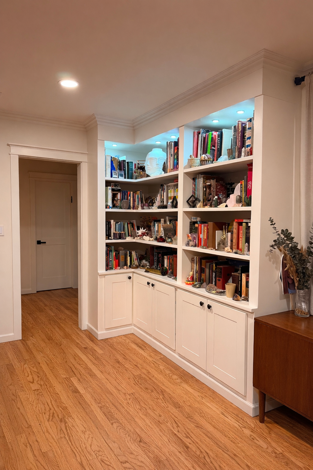 The interior also doubles as a dedicated crafting hub for the kids—storing art supplies, school projects, paper, and creative tools neatly out of sight but ready at a moment’s notice. By combining open display shelving with concealed storage below, this installation delivers organization without sacrificing style. It’s a seamless blend of beauty and practicality—where everyday function lives quietly behind timeless design.