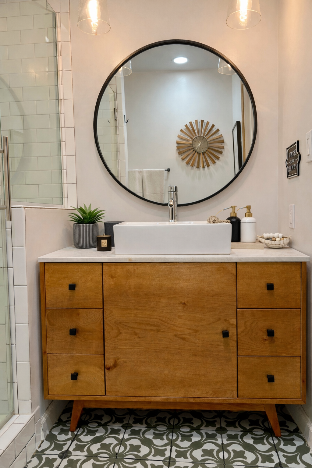 This bathroom blends mid-century warmth with modern simplicity. A rich wood vanity with clean lines anchors the space, topped with a sleek rectangular vessel sink and chrome faucet. The round black-framed mirror and minimalist sconces create balance and symmetry, while patterned floor tile adds bold character. White subway tile in the shower keeps the look timeless, resulting in a space that feels curated, inviting, and thoughtfully designed.